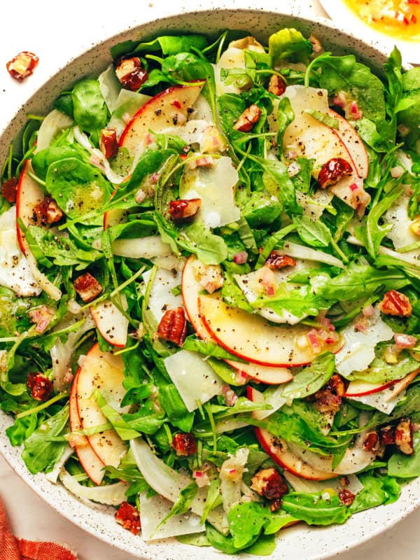 Our vibrant collection of salad recipes is full of fresh, feel-good favorites for any occasion. From green side salads to hearty entrรฉes, pasta salads to potato salads, panzanella to fruit salads and more, there’s something here for everyone! If you’re trying to add more greens to your week, start with the simple everyday side salad that we make multiple times a week — the dressing goes with just about everything!