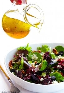 My favorite is Vibrant, which includes dried cherries, blue cheese, and pecans. And my favorite quick and easy dressing to go with it is — you guessed it — this White Balsamic Vinaigrette.