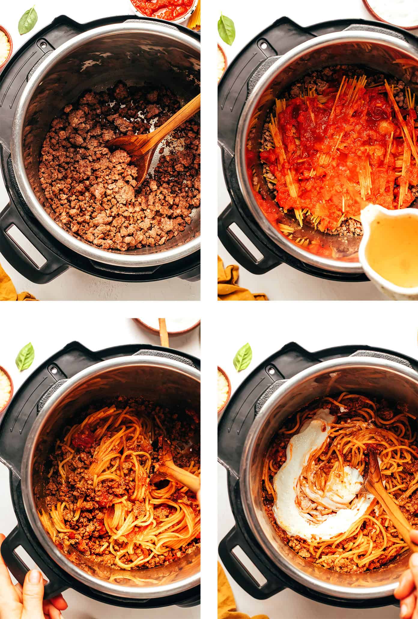 1. Sautรฉ beef.Turn the Instant Pot to Sautรฉ. Add olive oil and ground beef. Cook, crumbling the beef as you go, until browned and cooked through, about 5โ€“6 minutes. Stir in salt, Italian seasoning, garlic powder, and onion powder.