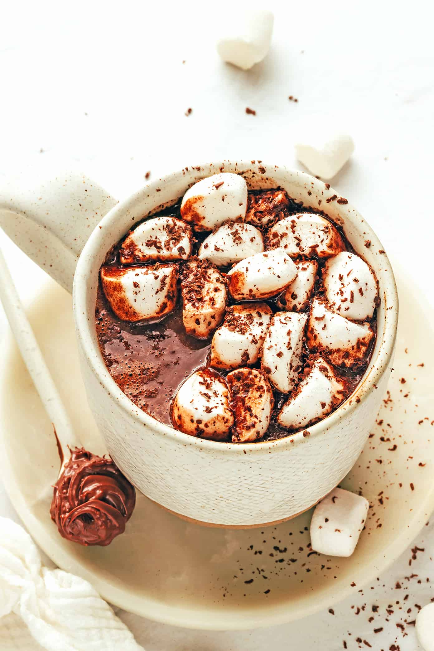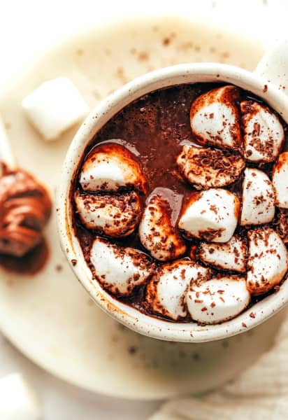 - Add graham crackers: Top the hot chocolate with a sprinkling of crushed graham crackers (and, optional, roast the marshmallows until charred) to give this more of a s’mores hot chocolate vibe.