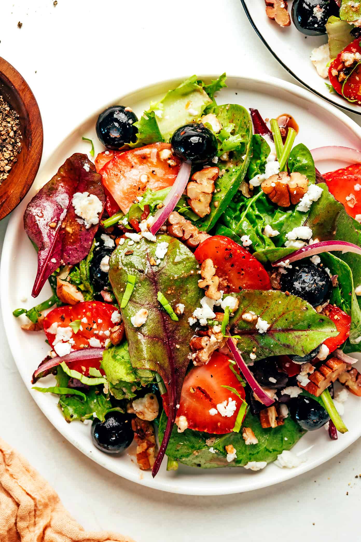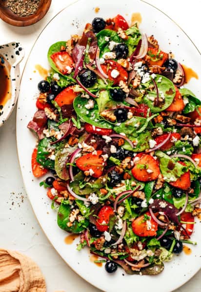 We’ve been enjoying serving this salad as a side dish lately, but you can easily add your favorite protein (such as chicken, steak, salmon) or a scoop of grains to turn it into a heartier main course. However you serve it, it’s impossible not to love this salad. So grab some fresh berries and let’s make a quick batch!