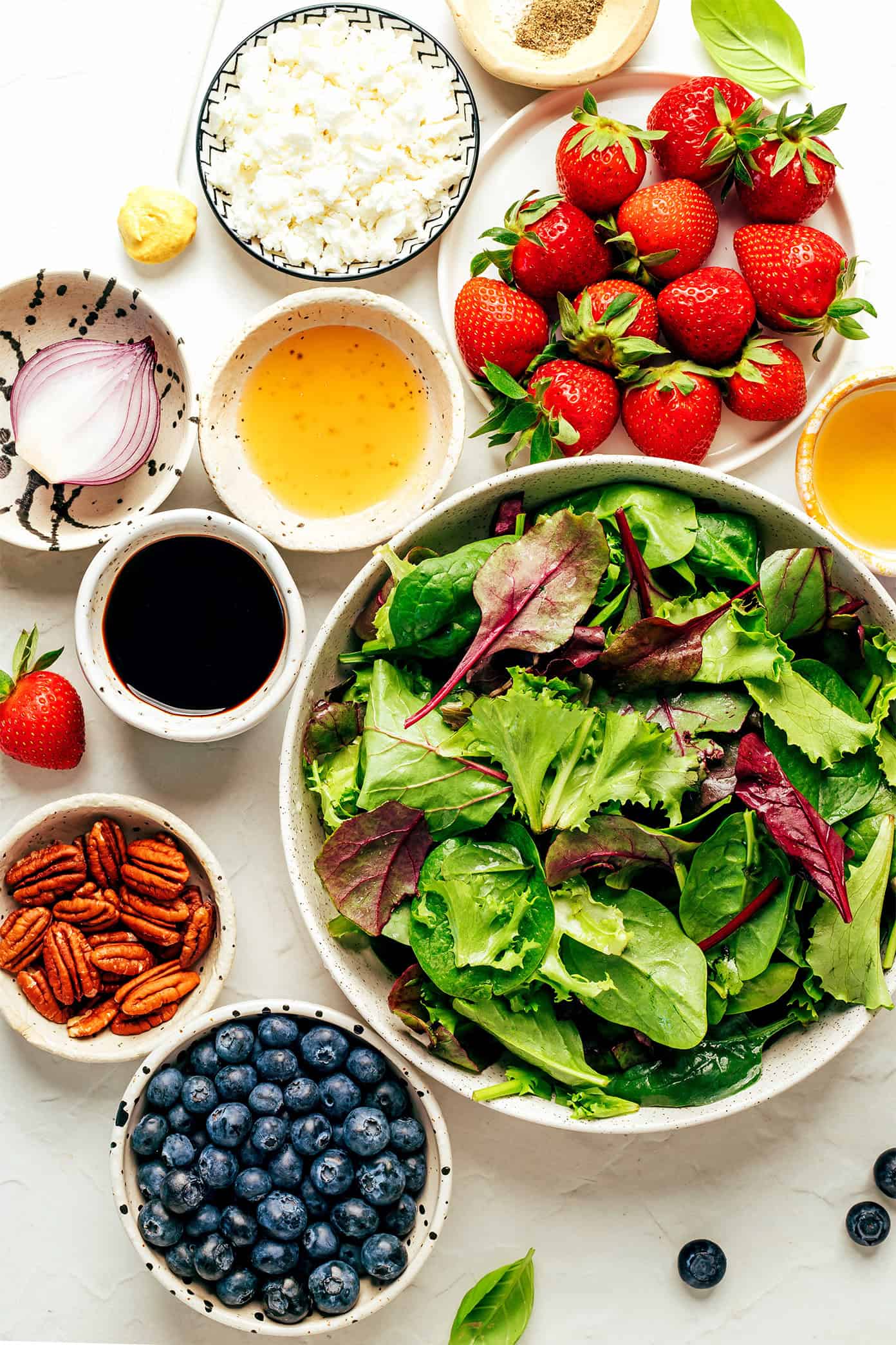 - Assemble the salad. Combine the greens, strawberries, blueberries, pecans, feta and onion in a large mixing bowl. Drizzle evenly with the vinaigrette and toss gently to combine.