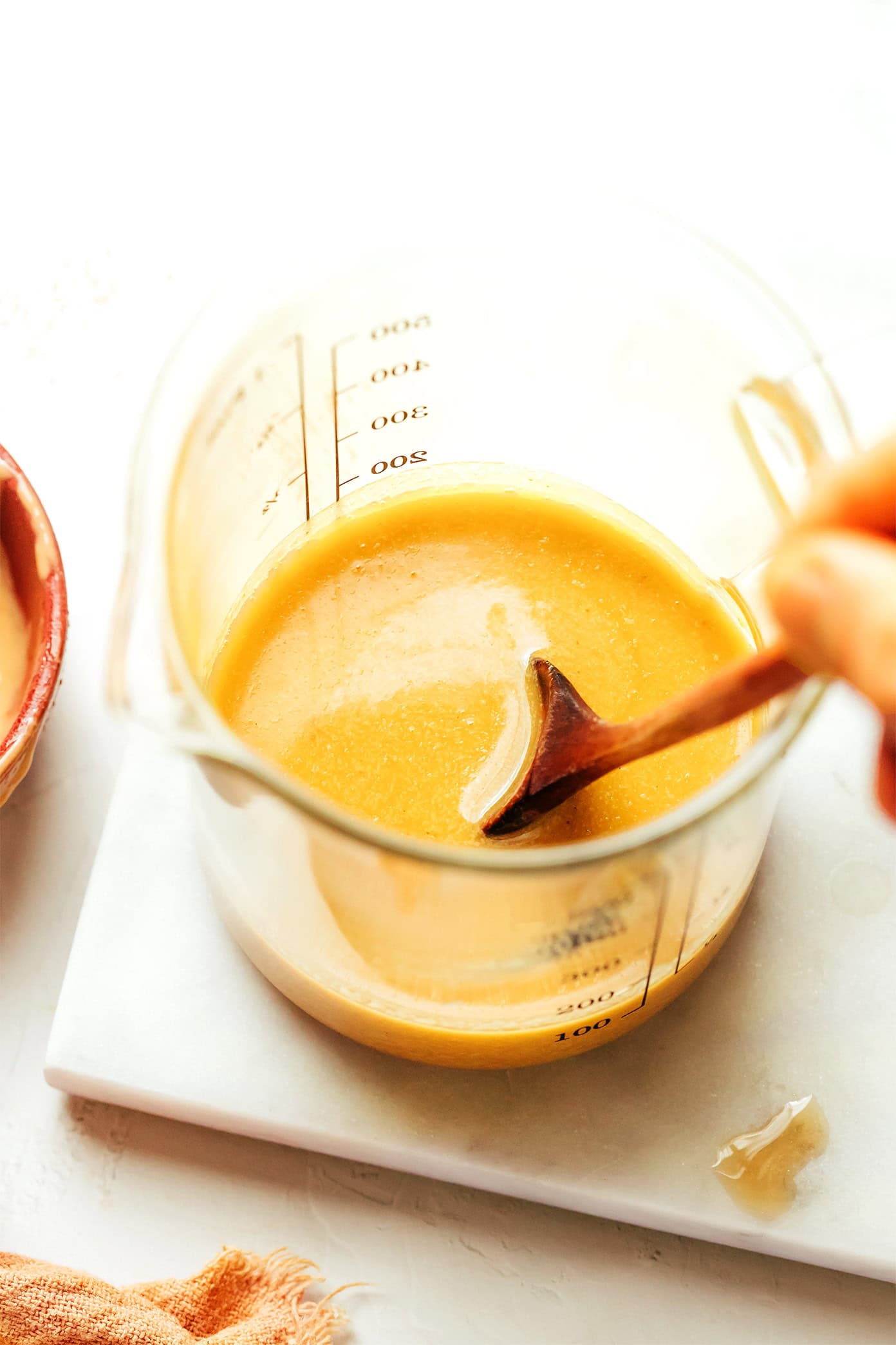- Make the dressing. In a small bowl or liquid measuring cup with a spout, stir together the olive oil, vinegar, peanut butter, sesame oil, mustard, honey, salt and cayenne until smooth.