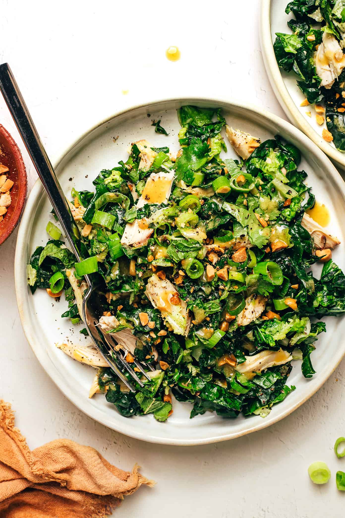 It’s made with a simple list of feel-good ingredients that come together quickly — shredded rotisserie chicken, thinly-sliced fresh kale, crunchy cabbage, lots of fresh mint and cilantro, crisp scallions, and dry-roasted peanuts. Then everything is tossed with a creamy, tangy, flavor-packed peanut dressing and served up with an extra sprinkling of crunchy peanuts to garnish. It’s the perfect balance of savory and sweet flavors that will have you coming back for seconds (or, um, thirds). And it just so happens to be naturally gluten-free and loaded with protein too — a winner all around!