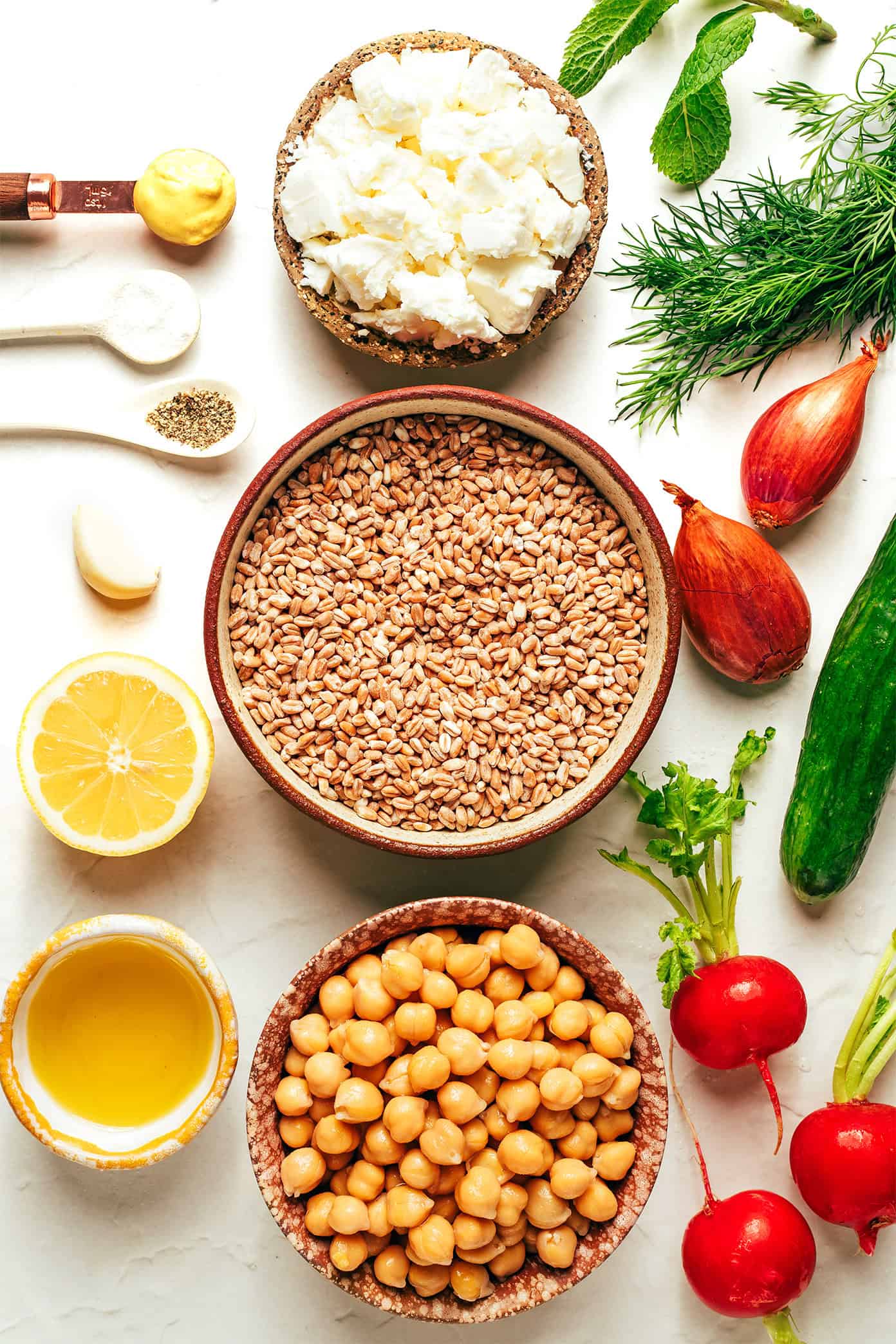 Here are a few quick notes about the ingredients that you will need to make this spring farro salad recipe: