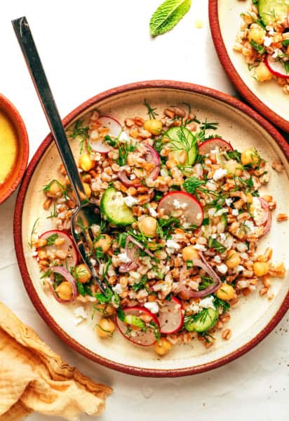 It’s loaded up with chewy farro and chickpeas, a crisp mix of cucumber, radishes and shallots, a sprinkling of tangy crumbled feta, loads of fresh herbs (I opted for mint and dill), and my favorite lemony everyday vinaigrette that pulls everything together. Each bite tastes wonderfully light and springy, especially thanks to all of those fresh herbs. And this salad holds up beautifully in the fridge if you’d like to prep the salad in advance for easy lunches or sunny picnics or springtime nights by the grill.