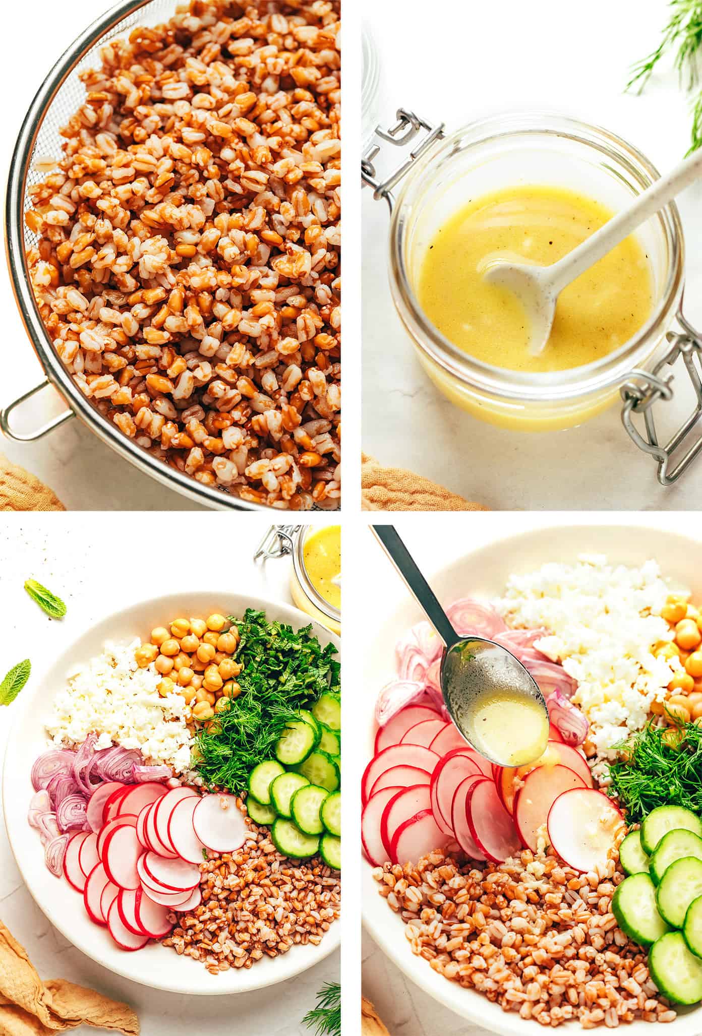 - Toss. Combine the chilled farro, chickpeas, feta, cucumbers, radishes, shallot, dill and mint in a large mixing bowl. Drizzle evenly with the dressing and gently toss to combine.