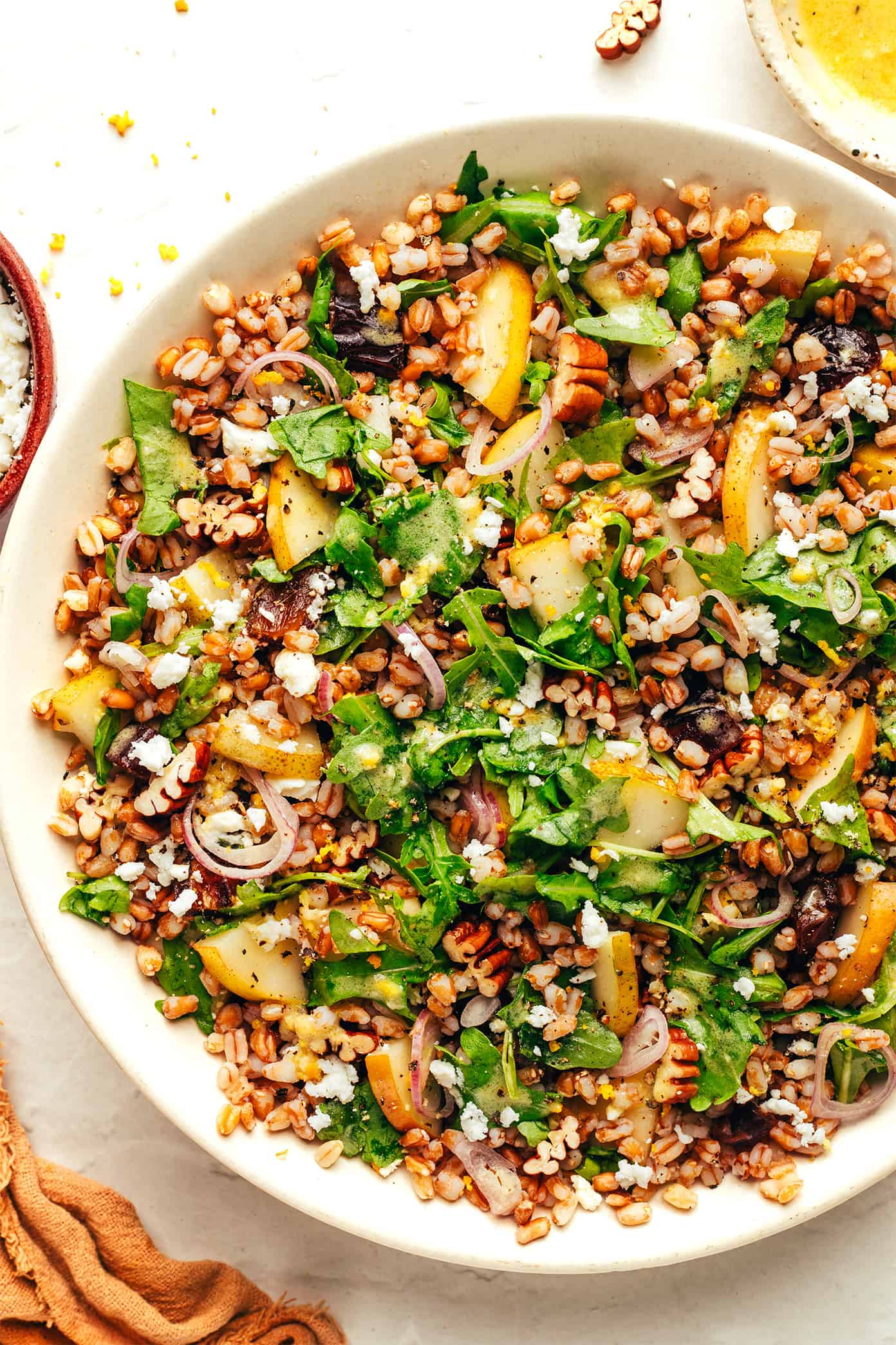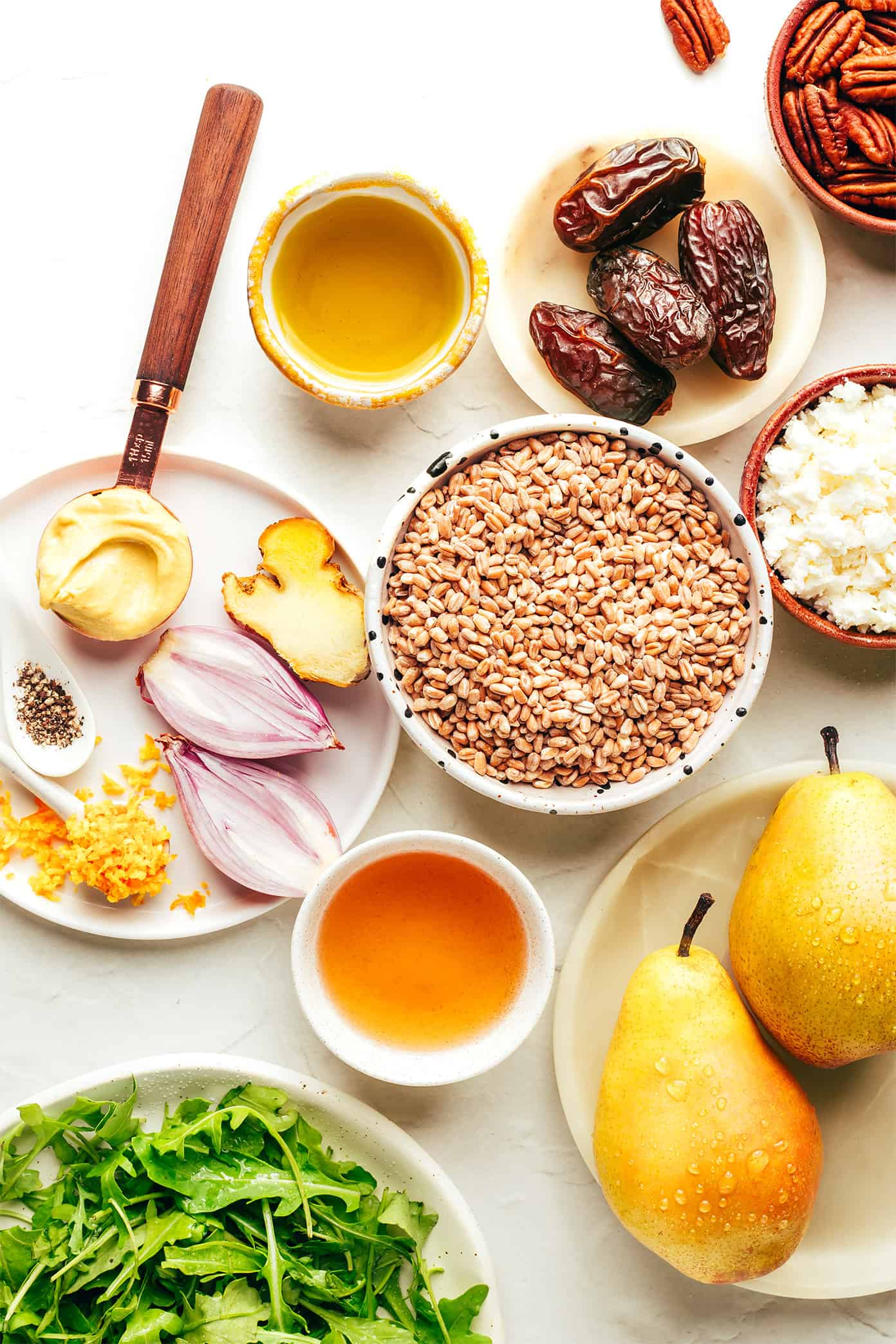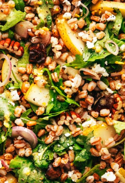 I could seriously live on this one for easy breakfasts, lunches or dinners this time of year. It’s loaded up with sweet and juicy pears (or apples, clementines, grapes…whatever fruit is most ripe that week), lots of chewy nutty farro, peppery chopped arugula, tangy crumbled goat cheese or feta, sweet chopped dates, crunchy toasted pecans and paper-thin sliced shallots. Then everything is tossed together in a vibrant orange ginger vinaigrette. So fresh, so filling, and seriously SO so delicious.