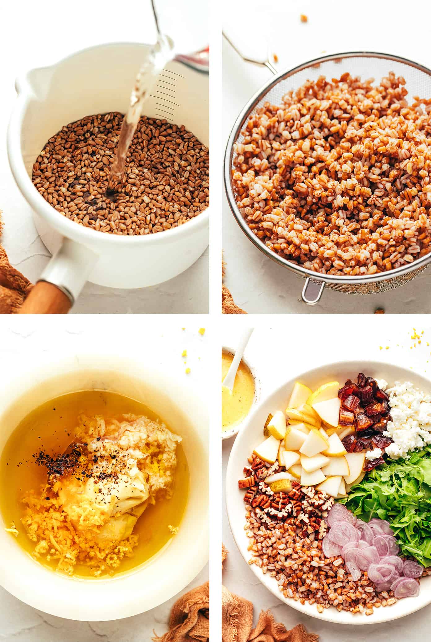 - Farro: This ancient grain with its deliciously nutty flavor and chewy texture serves as the perfect base for this salad. Feel free to use your preferred type of farro — whole, pearled or semi-pearled — and follow the package instructions (or read my Farro 101 guide) to boil the farro in salted water until it is perfectly al dente.