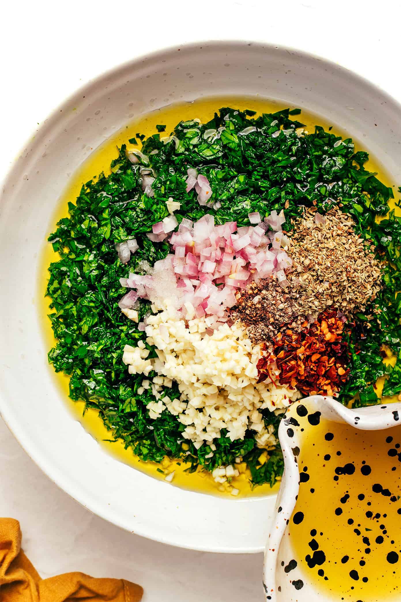 - Fresh parsley: Fresh parsley adds vibrant green color and the bright, grassy flavor that famously defines the Argentine version of this sauce. But other countries often add in fresh cilantro in addition to (or in place of) the parsley, so see the note for that below if interested.