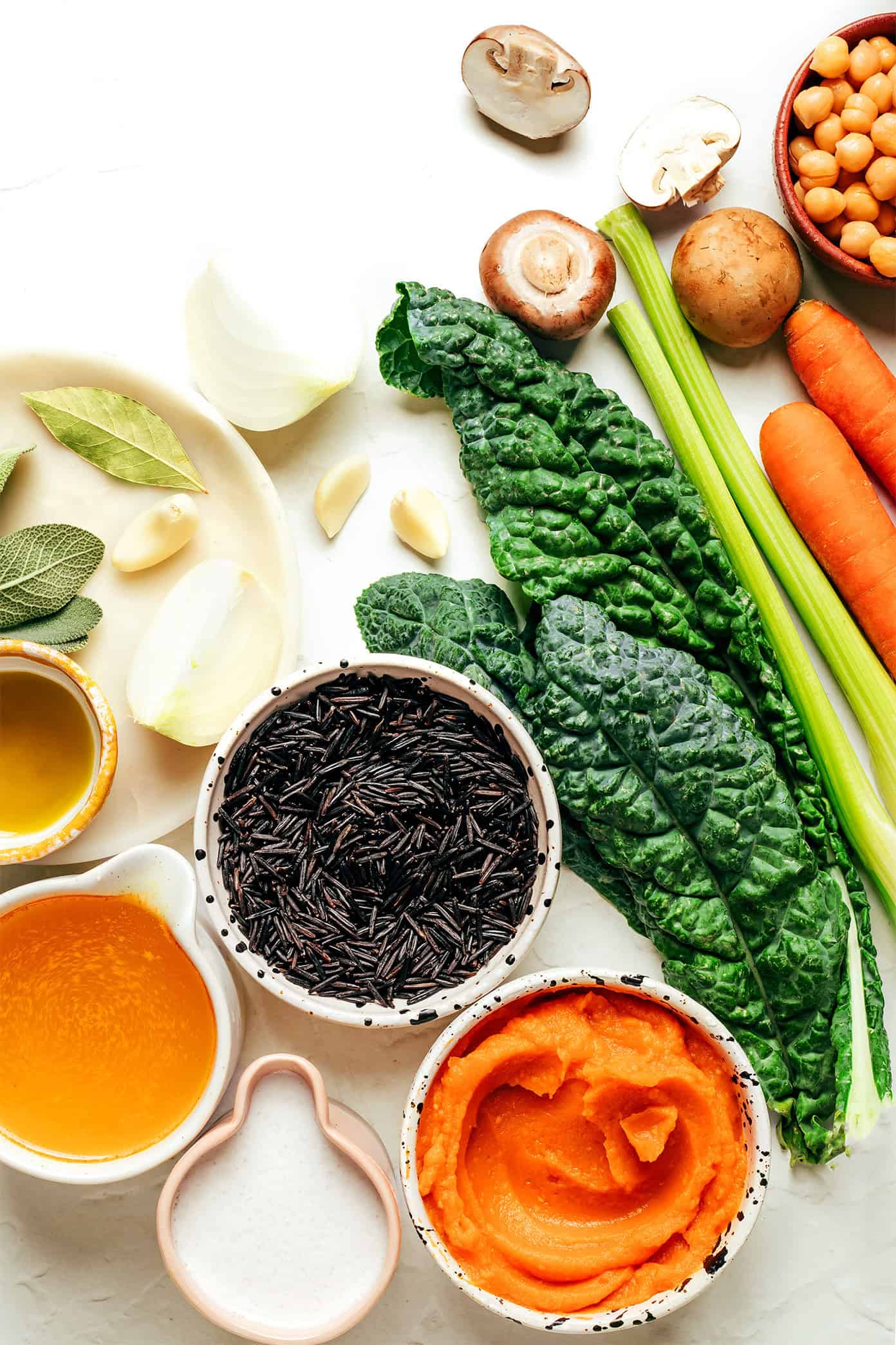 Instant Pot Instructions: Combine the carrots, celery, onion, mushrooms, garlic, vegetable broth, pumpkin purée, wild rice and bay leaf in the bowl of an Instant Pot. Cover and cook on manual (high pressure) for 25 minutes. Let the Instant Pot rest and naturally release the pressure for 10 minutes, then carefully open the vent and quick release the remaining pressure. Remove lid and discard the sage and bay leaf. Add the coconut milk, chickpeas, kale, and stir to combine. Taste and season with salt and pepper as needed.