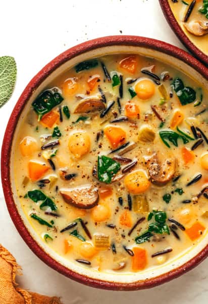 I’ve loaded this one up with seasonal veggies, chewy wild rice, protein-packed chickpeas, and vibrant chopped kale — all simmered together in a creamy pumpkin-sage broth — and each bite couldn’t be more cozy and delicious. The mix of savory, slightly-sweet, creamy and earthy flavors works so well here. And it’s one of those soups that’s wonderfully hearty without being too heavy. My favorite!