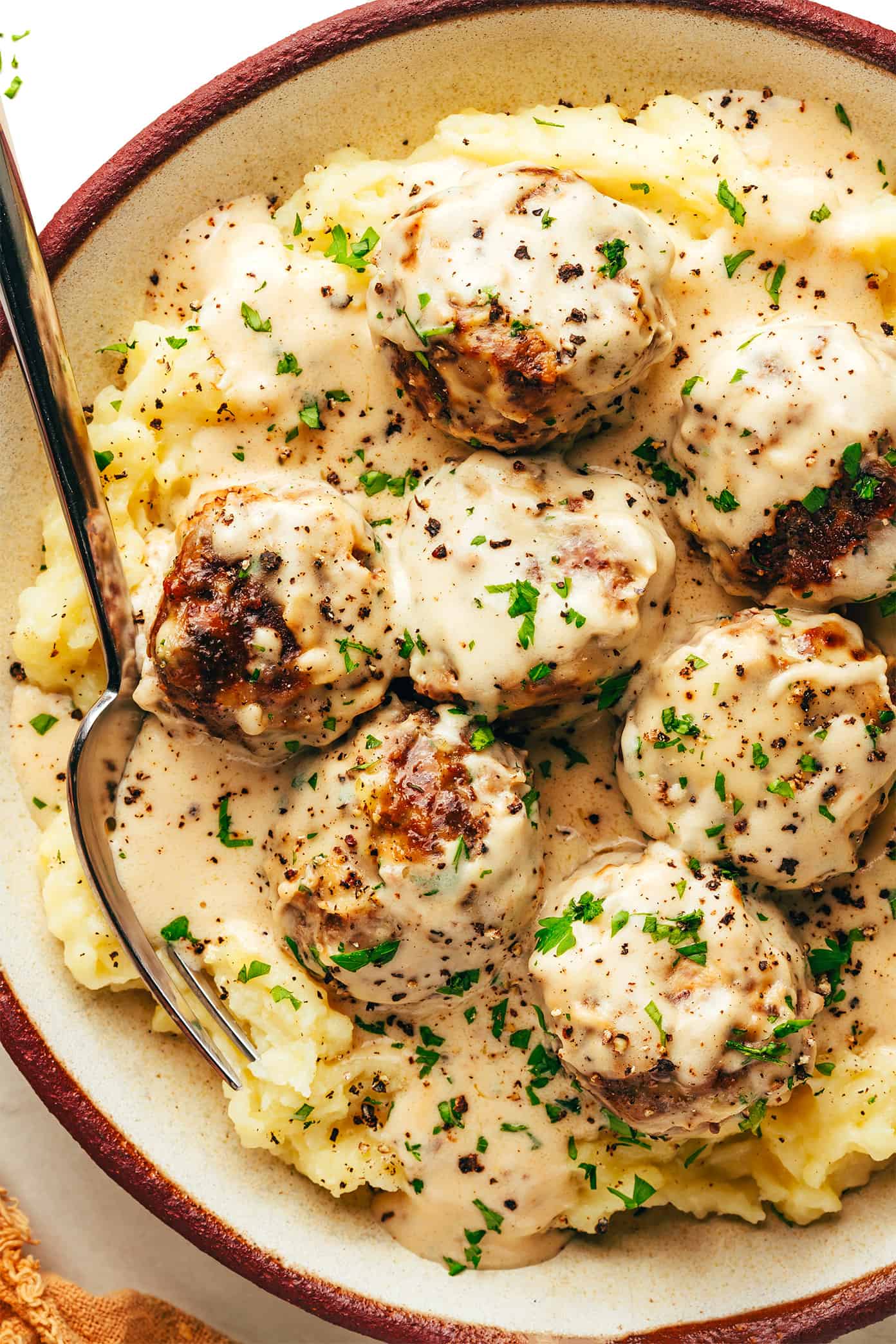 Who’s ready for a big bowl of Swedish meatballs served over buttery mashed potatoes with a generous ladle of creamy gravy on top? โก