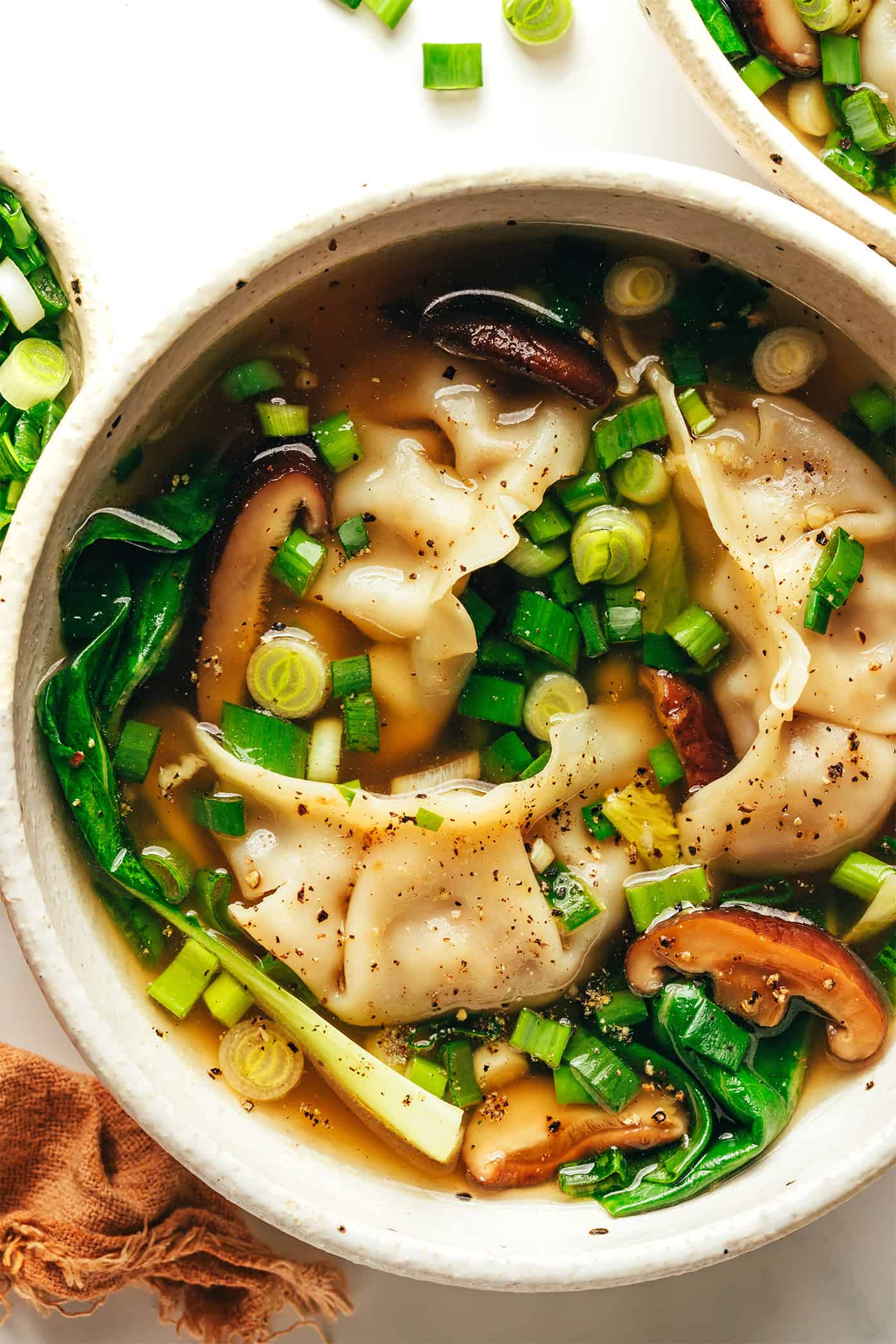 I especially love this recipe because it comes together in a snap (just under 25 minutes if you’re moving quickly). Plus it’s super-easy to customize with your choice of dumplings (vegetarian or meat-filled), veggies, and toppings. We typically just opt for a light garlic-ginger broth drizzled with a hint of toasted sesame oil, but feel free to add in chili crisp, miso, curry paste, or whatever may sound good here to jazz things up. This recipe is endlessly versatile, so don’t hesitate to play around with the ingredients and make it your own.