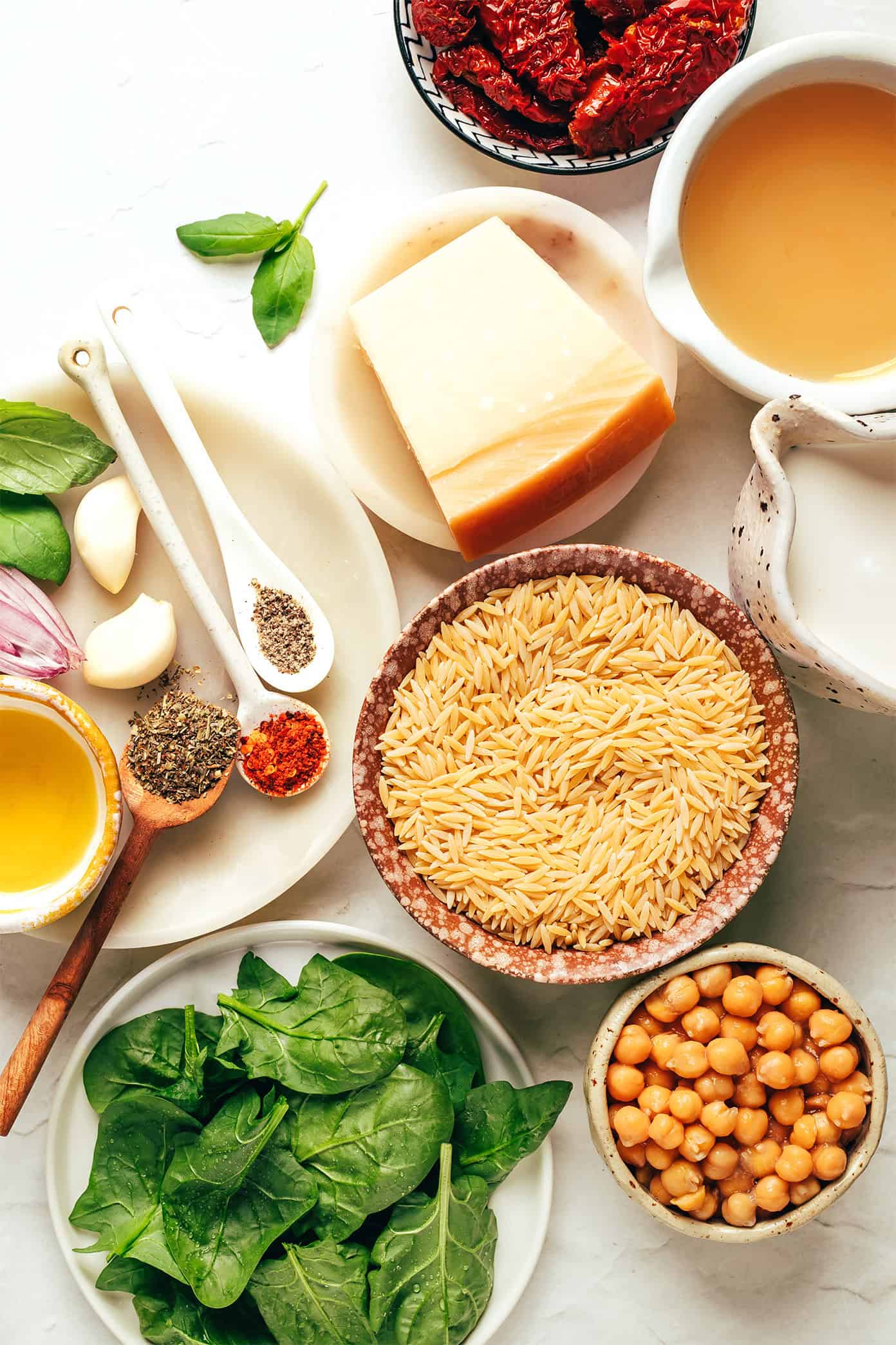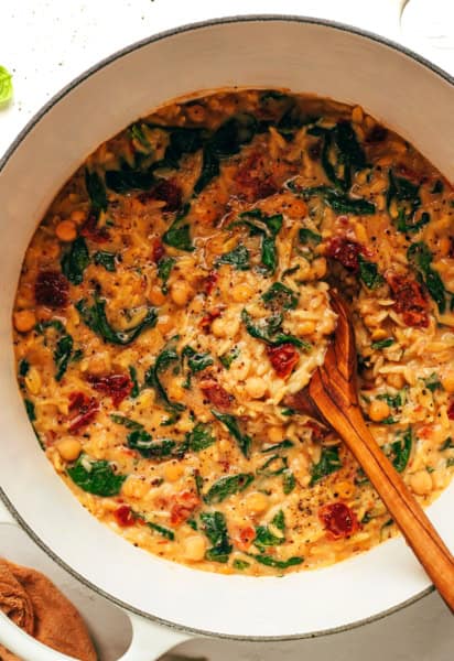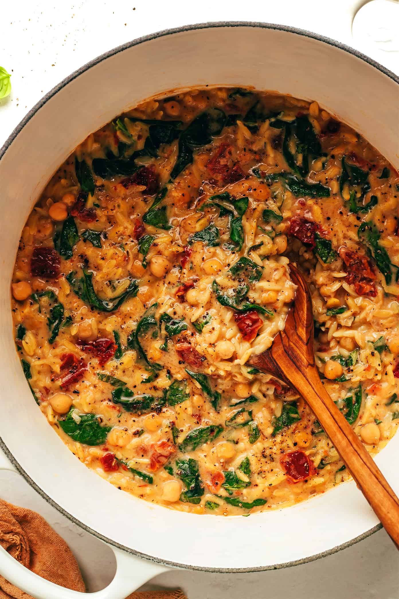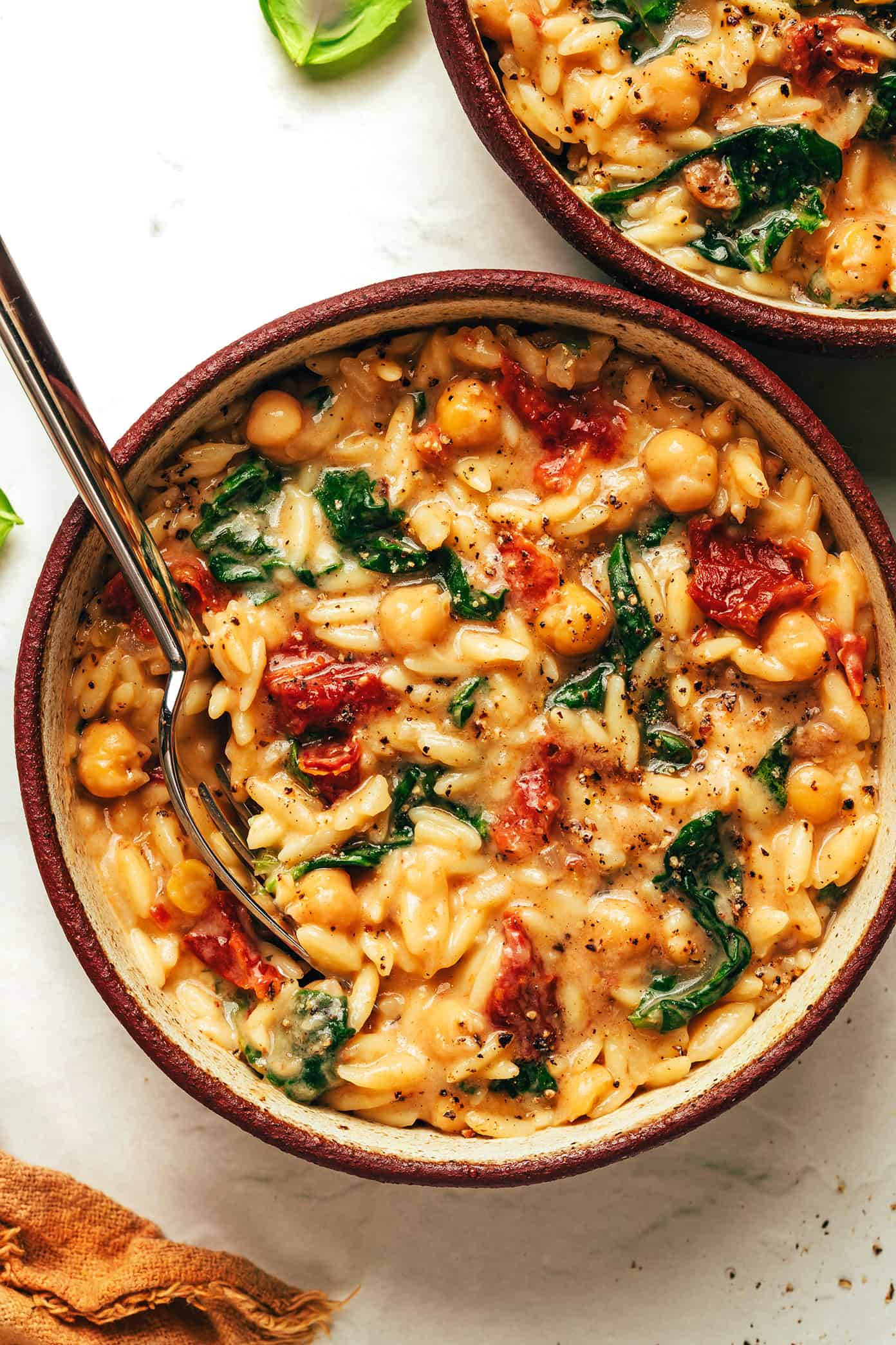 This one-pot chickpeas and orzo dish is simmered in a creamy garlic sauce with sun-dried tomatoes, basil and spinach. So delicious and ready to go in 30!