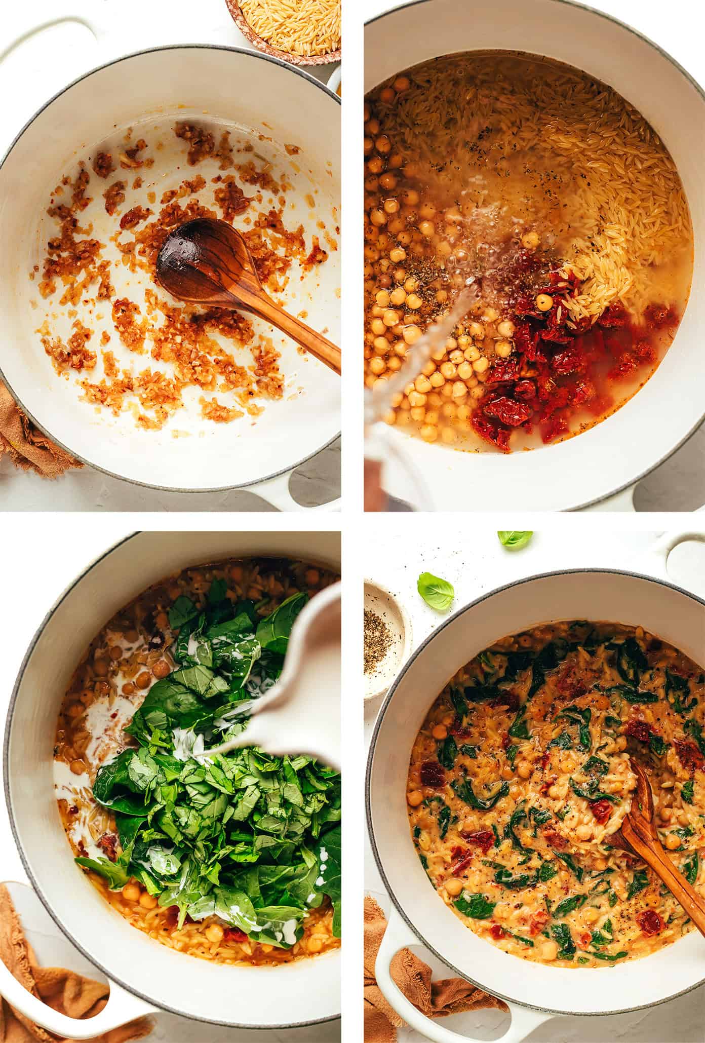 2. Simmer. Add the chickpeas, vegetable broth, orzo, sun-dried tomatoes, Italian seasoning and stir to combine. Continue cooking until the mixture reaches a simmer, stirring frequently. Reduce heat to medium-low, or whatever temperature is needed to maintain a low simmer. Then continue simmering, stirring frequently, until the orzo is just shy of al dente.ย