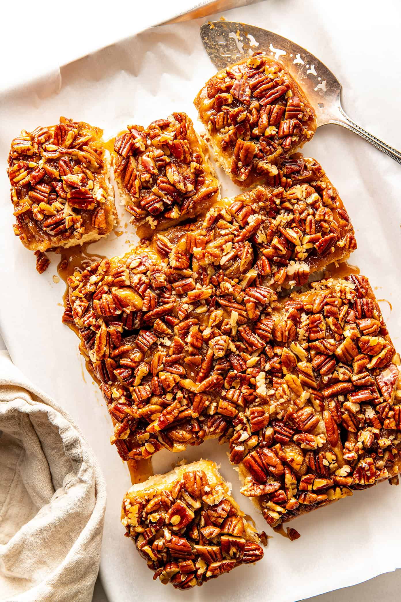 - Shape the buns. Starting from the long edge, roll the dough tightly into a log. Slice into 12 equal pieces (about 1½ inches wide). Arrange the rolls cut-side down over the pecan-caramel layer in the pan.